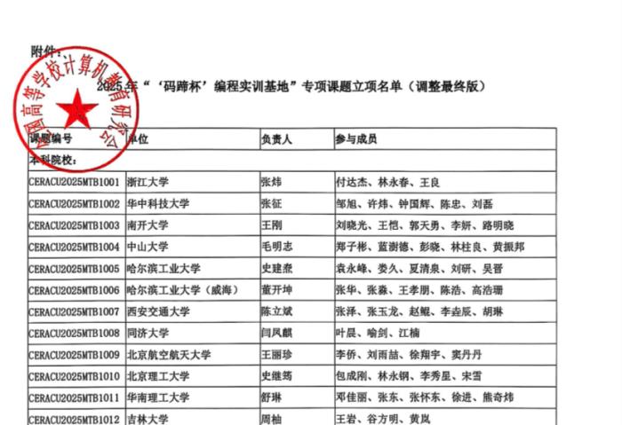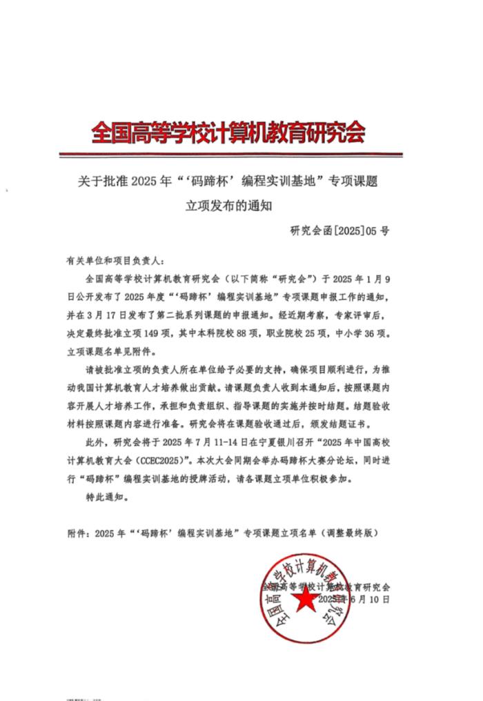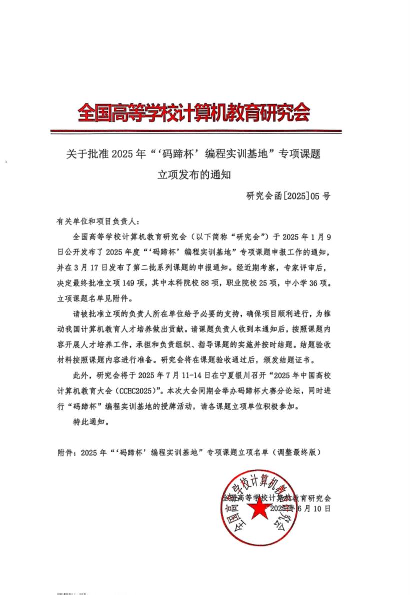 全国计算机基础研究会在2025年1月公开发布了2025年度“码蹄杯”编程实训基地转向课题申报工作的通知,经过长期的考核和专家评审后,最终批准立项149项,其中本科院校88项,职业院校25项,中小学36项。本科院校中有国内著名高校:浙江大学、华中科技大学、哈尔滨工业大学等众多高校,我校也顺利获批该项目。