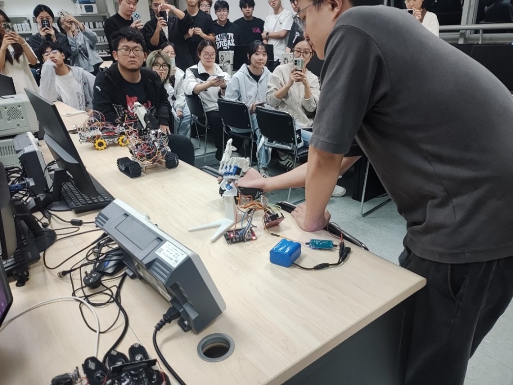 公司展示环节,成都粤嵌的工程师团队带来了令人惊叹的技术展示:他们基于自主研发的嵌入式开发板,现场演示了智能机械手臂系统、智能小车控制模块等创新作品。当工程师通过手机APP实时调节小车控制精度数据,或是通过语音控制机械臂的指令时,同学们纷纷围上前仔细观察,时而发出赞叹,时而提出专业问题。这种将抽象技术转化为具象应用的展示方式,不仅让嵌入式开发变得触手可及,更在同学们心中种下了技术落地的种子。