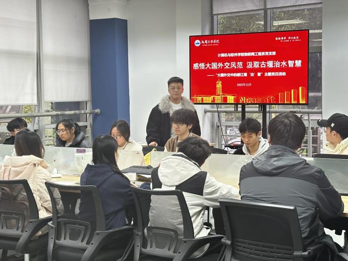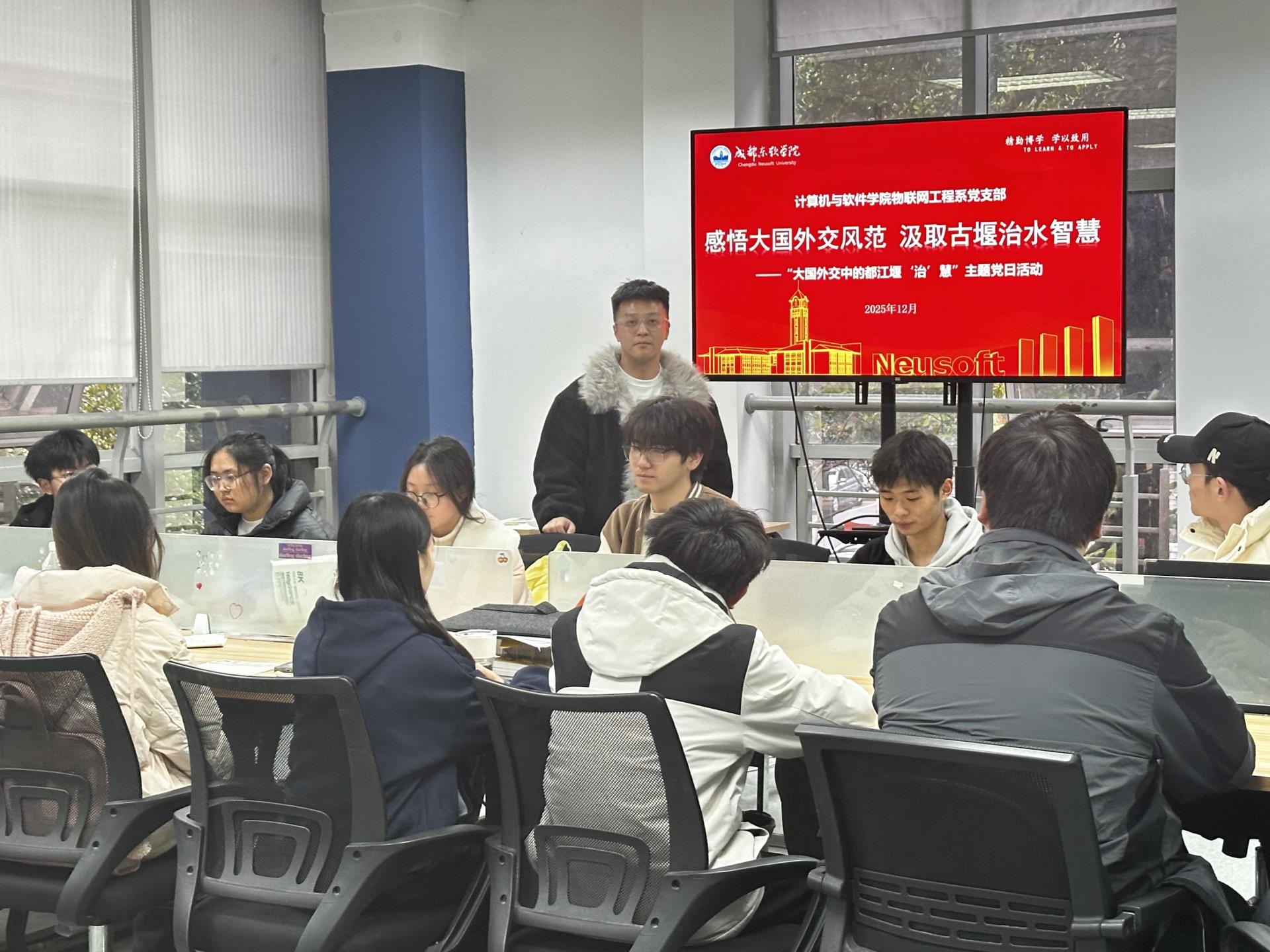 为引导大学生厚植家国情怀、拓宽国际视野,12月9日,物联网工程系党支部开展以“大国外交中的都江堰‘治’慧”为主题的党日活动,让党员学生在沉浸式学习中感悟都江堰“治”慧与中国外交理念的深层共鸣。