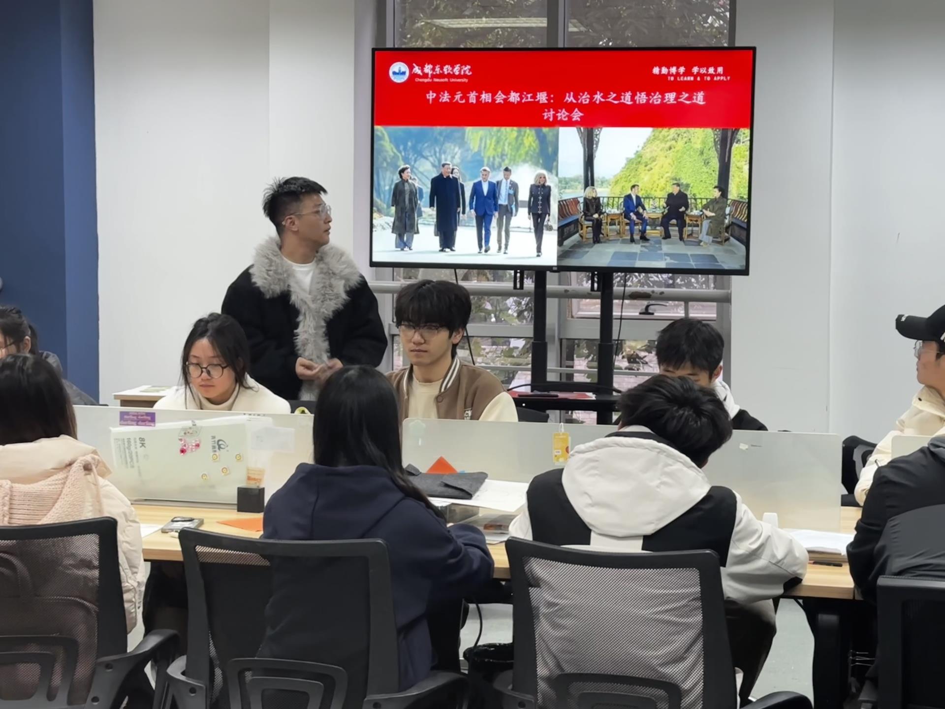 随后大家紧扣中法元首都江堰会晤热点,围绕习近平主席概括的“因地制宜、顺势而为、天人合一、治水利民”十六字治水智慧,通过专题讨论、师生互动等形式解读治水智慧与大国外交、教育规律的契合点,讨论会则聚焦中法合作成果与大学生实践,将宏大主题转化为节约资源、文明言行、创新学习等具体行动。