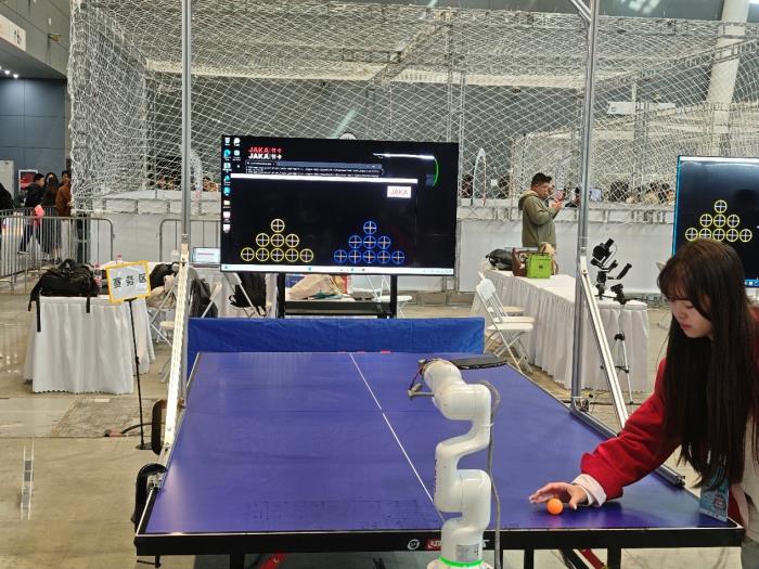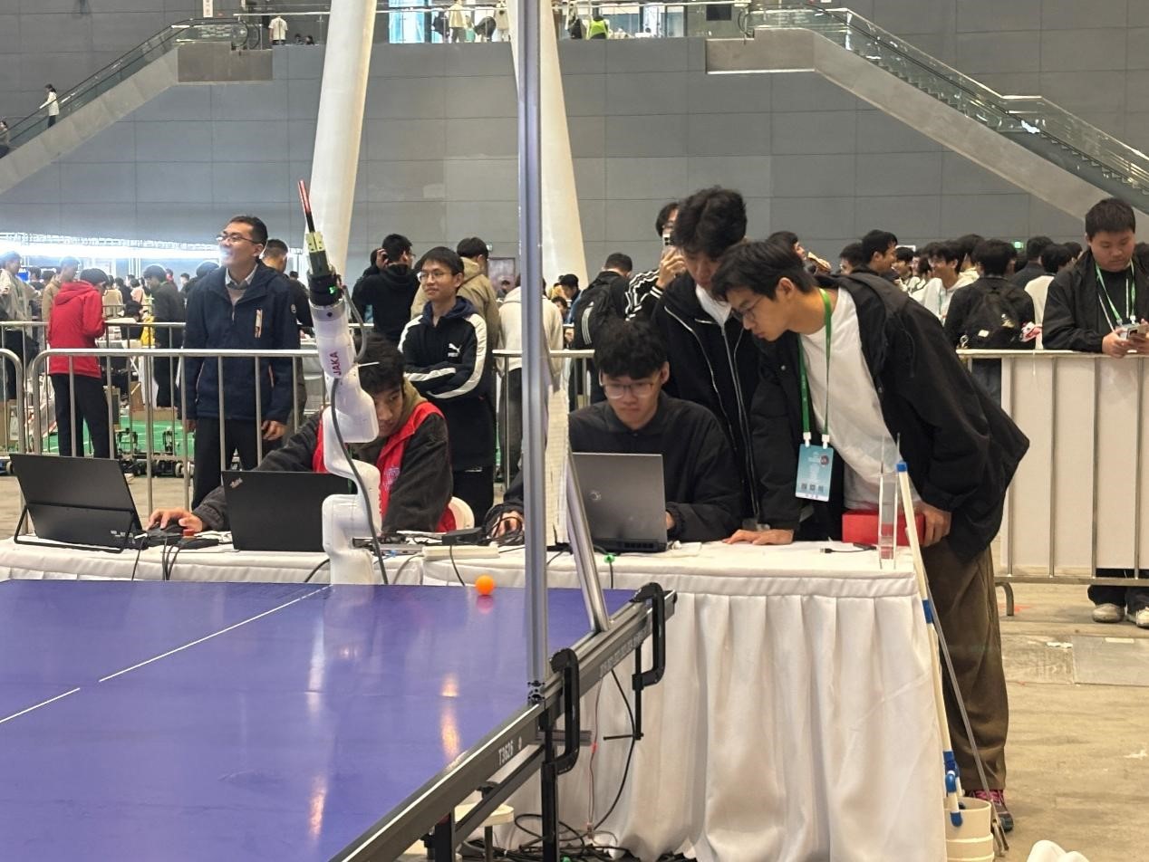 本届大赛设大学、职教、青少年三大赛道共 60 余个赛项,“乒乓球机器人 2D 技能赛道” 为核心赛项,且今年新增对抗赛环节,赛制更具挑战性:该赛道分为静态击球、动态击球、对抗赛三个阶段。静态击球阶段要求机械臂对固定位置的乒乓球进行精准击打,需完成10次击球,并且进入对应记分框得分;动态击球阶段难度升级,乒乓球从随机位置、随机角度抛出,机械臂需在每秒 30 帧视觉捕捉下,0.5 秒内完成轨迹计算与关节调整,确保落点误差≤5 厘米;今年新增的对抗赛阶段则模拟真实乒乓球对抗场景,两队机械臂轮流击球,实行积分制,不仅考验机械臂的响应速度,更需团队动静结合适配机械臂的击球节奏与策略,技术门槛极高—— 也正因如此,这里成为各高校比拼硬实力的 “主战场”。总决赛对抗赛中,我校团队与上海交通大学、山东大学等高校竞技时,我校团队曾多次面临 “极限挑战”:在一场关键对决中,两校分数僵持不下,我校参赛学子沉着应对,通过实时调整算法参数、优化击球策略,最终以微弱优势逆转战局。这一幕也成为赛场内外热议的 “高光时刻”,更印证了团队在高压环境下的技术把控能力与心理素质,展现了东软学子优异的综合能力。