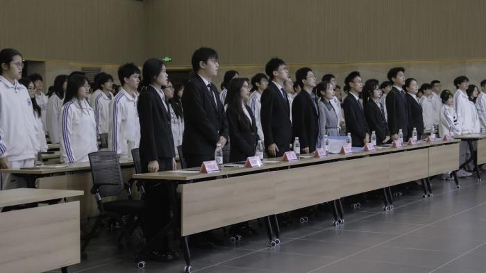 仪式在庄严的《义勇军进行曲》中拉开帷幕。伴随着激昂的旋律,全体人员肃立注目,高唱国歌,嘹亮的歌声回荡在报告厅内,不仅传递出对祖国的无限热爱与崇高敬意,更展现出青年学子昂扬向上的精神风貌,为整场仪式奠定了庄重而肃穆的基调。