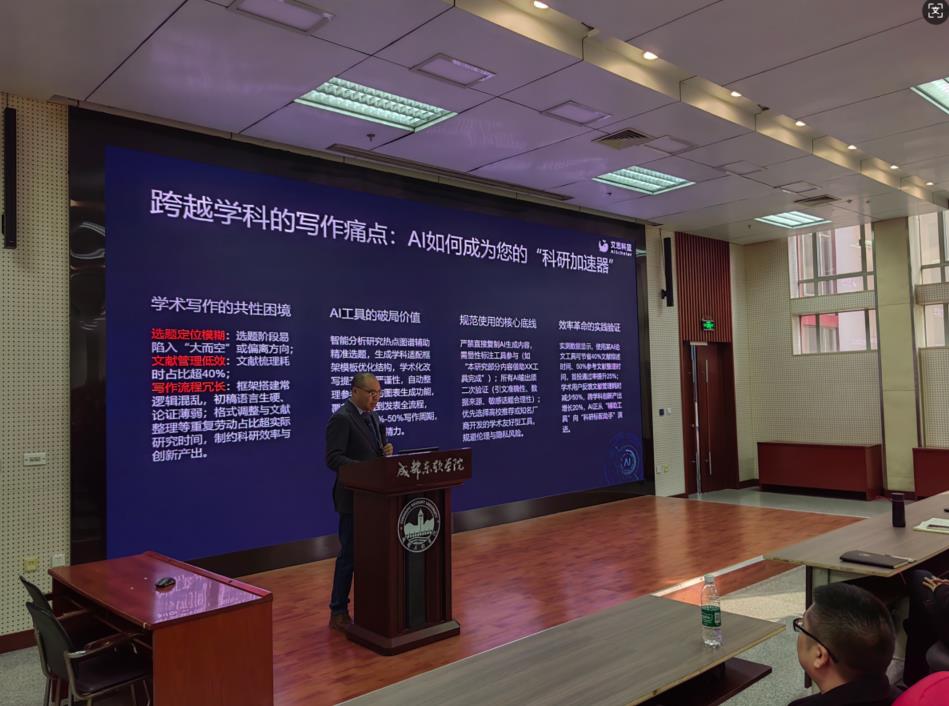 为深入贯彻落实习近平总书记“以人工智能引领科研范式变革,加速各领域科技创新突破”的重要指示精神,帮助师生系统掌握生成式人工智能在学术研究中的规范应用方法,12月2日,计算机与软件学院与智能科学与工程学院联合艾思科蓝公司,特邀成都信息工程大学黄源源副教授开展“AI赋能论文写作与发表”公益专题讲座。