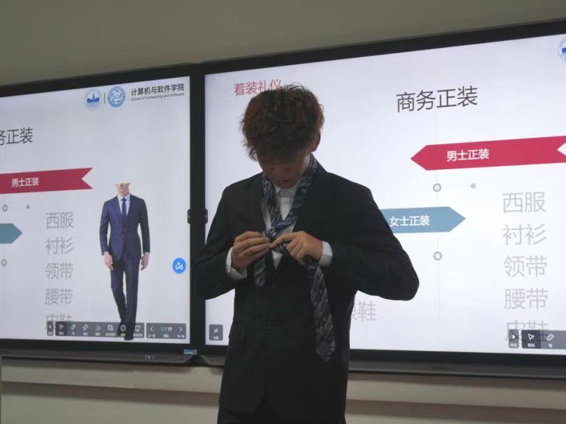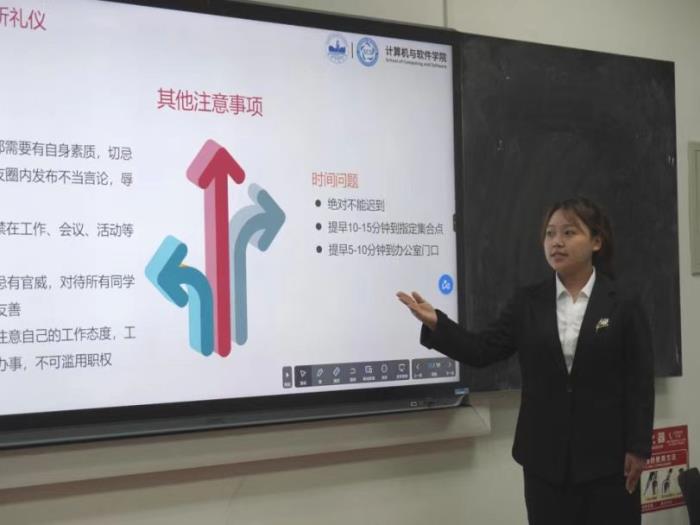 为进一步提升团委学生会干部的综合能力,塑造积极向上、专业得体的学生骨干形象,近日,计算机与软件学院团委学生会精心组织开展了一场礼仪专题培训。此次活动旨在充分发挥学生组织在服务师生、建设文明校园中的桥梁作用,通过提升学生干部的服务意识、涵养文明校风、增强团队凝聚力与个人修养,助力他们在日常工作中更好地发挥示范引领作用。
