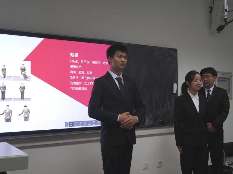 在仪态礼仪实操教学环节,讲解人亲自示范标准站姿、坐姿及行走姿态. 通过现场演示与互动,邀请同学们现场模仿、纠错并调整,让他们亲身体会到规范仪态所传递的自信与尊重,深刻认识到“举止见修养”的内涵,有效提升了学生干部的形体表现力与实际应用能力。