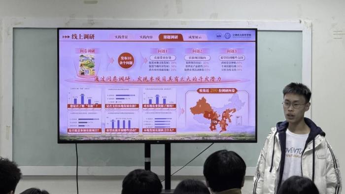分享会现场,杨帅主席代表团队作总结汇报。他从教学开展与实践推进两大方向,系统梳理了此次暑期三下乡活动的整体情况。本次实践创新采用“1+4+6”模式,以“青春为中国式现代化挺膺担当”为核心。各项工作均取得显著成效,被成功评为暑期三下乡社会实践重点团队。