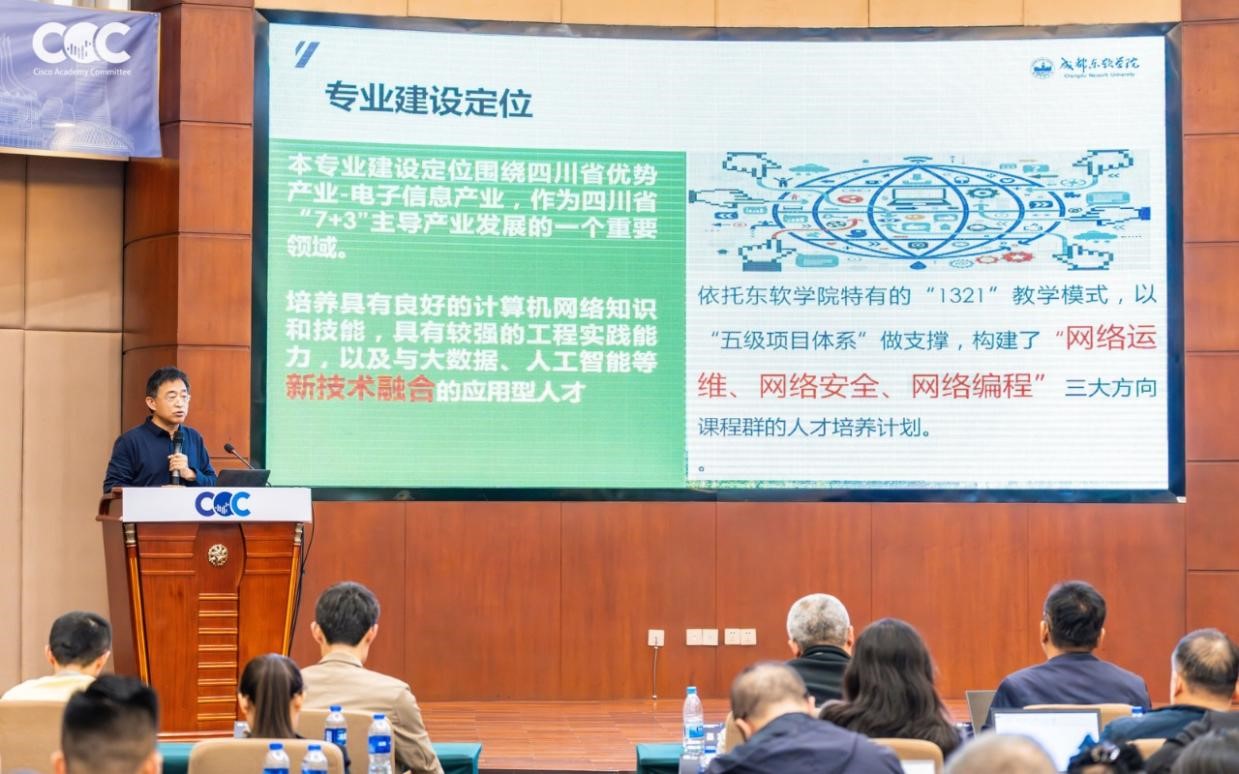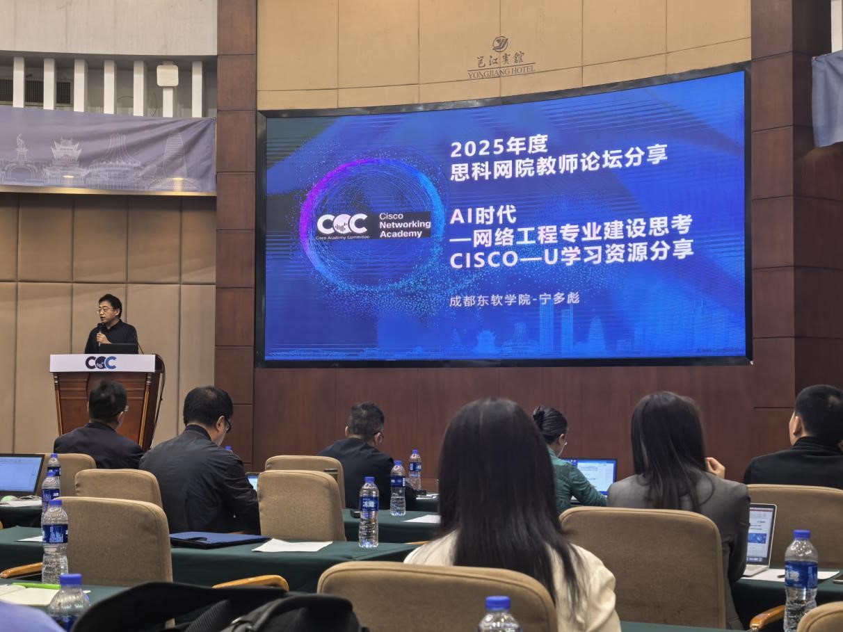 2025年11月15日,2025年度思科网院教师论坛顺利举办,成都东软学院计算机与软件学院院长宁多彪教授受邀发表主题分享,结合成都东软学院网络工程专业建设实践,围绕 “AI 时代网络工程专业建设” 展开深度探讨,从专业定位等方面分享如何培育适应新时代需求的网络工程人才。