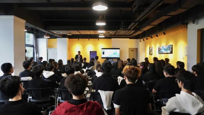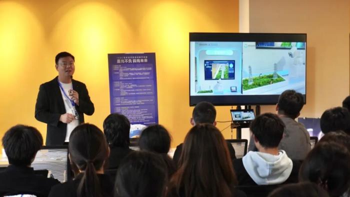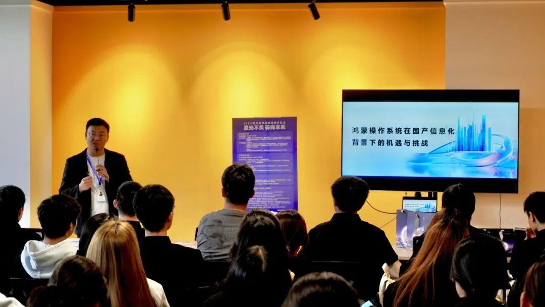 在主题分享环节,首批华为鸿蒙高级工程师张韬老师带来了“鸿蒙NEXT:原生互联的星辰大海”的精彩分享。张老师凭借深厚的技术积淀和丰富的行业经验,深入浅出地剖析了鸿蒙NEXT的技术架构与原生互联的广阔前景,为学生们打开了鸿蒙技术的认知大门。现场学生专注聆听,反响热烈。