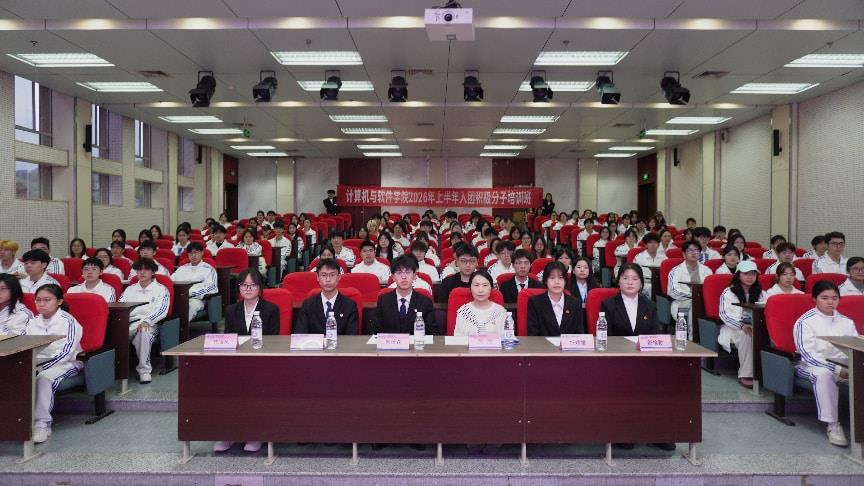 为深入学习贯彻习近平新时代中国特色社会主义思想,全面领会2026年全国两会精神,切实提升学院青年思想政治素养,引导广大青年学子坚定信念、紧跟党的步伐,积极向团组织靠拢,计算机与软件学院于3月24日在A3-104报告厅举行2026年上半年入团积极分子与大学生骨干培训班开班暨第一堂课,正式拉开了学院青年思想引领与能力提升专项工作的序幕。