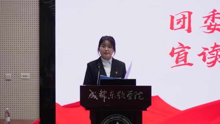 计算机与软件学院团委秘书长舒愉歡同学宣读团校规章制度,细化培训期间的考勤管理、实践参与等具体要求,明确奖惩与评优细则,号召全体学员严于律己、认真学习,确保培训取得实效。