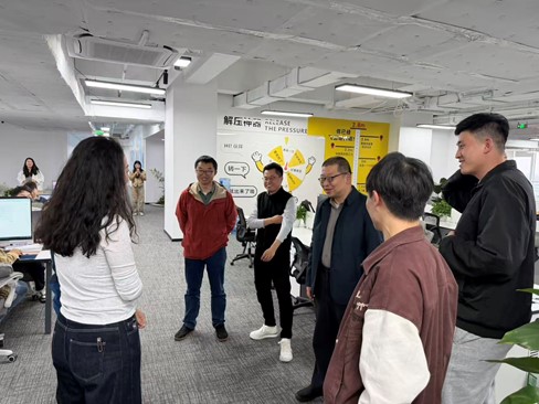 交流伊始,陈龙总经理带领秦海玉、仲宝才两位副院长参观了公司办公环境、研发区域及业务展示区,详细介绍了公司的发展历程、核心业务布局与未来发展规划。参观过程中,两位副院长偶遇了4名在该公司工作的计算机与软件学院学子,两位副院长鼓励他们立足岗位、踏实进取,充分发挥专业所长,为企业发展贡献力量,同时叮嘱他们常回母校看看,加强与学院的联系。据悉,成都柏岁创新科技有限公司是柏年乐居集团旗下公司,是一家深耕“银发经济”领域的科技创新企业,核心产品是“悦龄生活”APP。目前公司正处于快速发展阶段,对计算机类专业人才有着迫切需求,陈龙总经理重点阐述了公司在技术研发、项目落地过程中对人才的能力要求,希望能与学院建立长期稳定的人才输送合作关系。